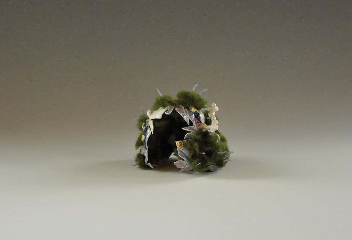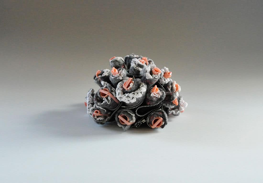 My current work is an ongoing investigation of wool, a renewable resource juxtaposed with the permanence of man-made materials.By combining elements such as felted wool, porcelain and discarded objects, I create assemblages to explore the role of cultural debris as an inherent part of the environment, presenting an alternate reality of what has been observed in my day to day life. Fascinated with the delicacy and strength of wool, my process includes both wet felting and needle felting as a means of tangling and meshing together individual fibres into a cohesive material. Multiple variations of hybridized sculptures explore the innovations of biological adaptation and response. Nature is the platform; a stepping stone to present the exploration of the cycle from inception to decomposition and the complexities of that journey.