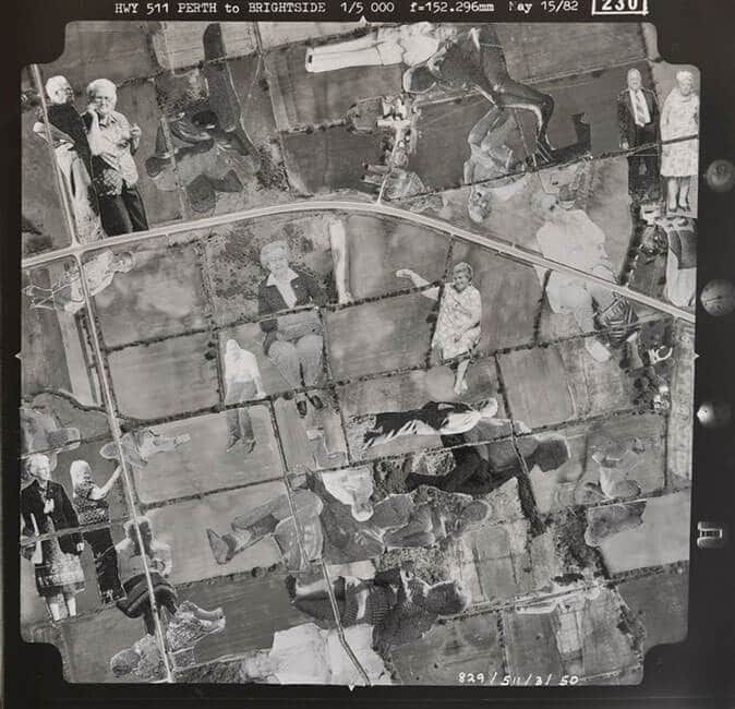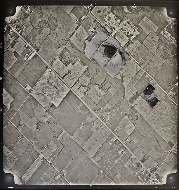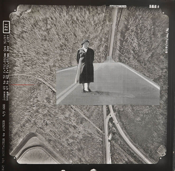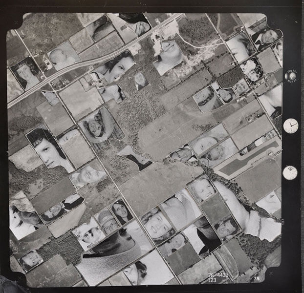I am examining our connection to the land through a series of work using collage of black and white aerial and familial photographs.