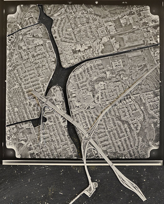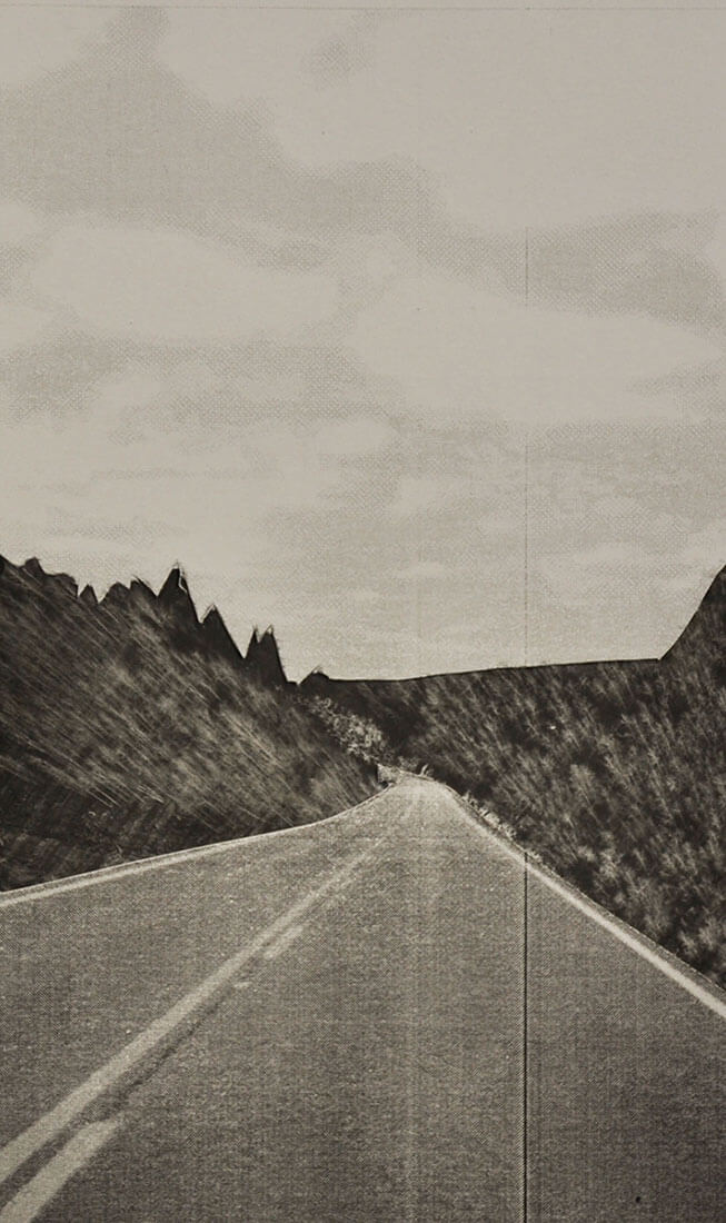 I am interested in our relationship with the land and explore this idea by integrating pieces of photographs of people, roadways, fields and buildings into a collage, often combining aerial and elevation perspective together into one image. Land and people are unified through the absence of colour to express our close bond. I explore visual impact by shifting back and forth between large contrasts in scale and value of the imagery. I fracture faces, bodies and reform them around the roadways and landscape. My family history inspires me. By reassembling the subject of the photos, I create a narrative of my heritage as it relates to the lives of my ancestors and their assimilation of land. I explore the subtle integration of imagery by matching clothing texture to land where it is difficult to distinguish the difference between land and human. Parts of bodies are revealed while others remain concealed; I am exploring where people and land intersect.