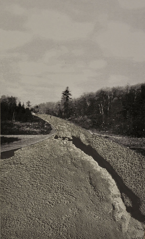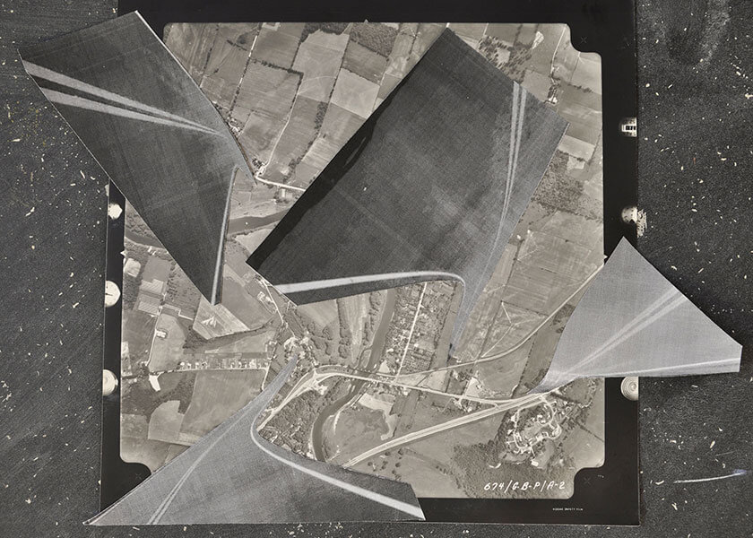 The aerial photograph is a commonplace article with a given function. It reveals the marks we make building shelter, planting and fracturing the surface with roadways, a record of a given moment in time. My collages transform the content of the photos, telling the story of people and land, an interconnection both lifelong and temporary.